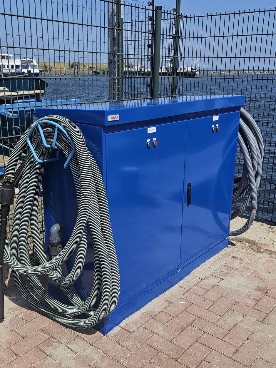 Um den rauen Witterungsbedingungen auf dem Wasser standzuhalten, ist die Schmutzwasserstation mit einem soliden Edelstahlgehäuse (RVS 304) und einer Pulverbeschichtung ausgestattet. Sie kann in jeder RAL-Farbe ausgeführt werden.
